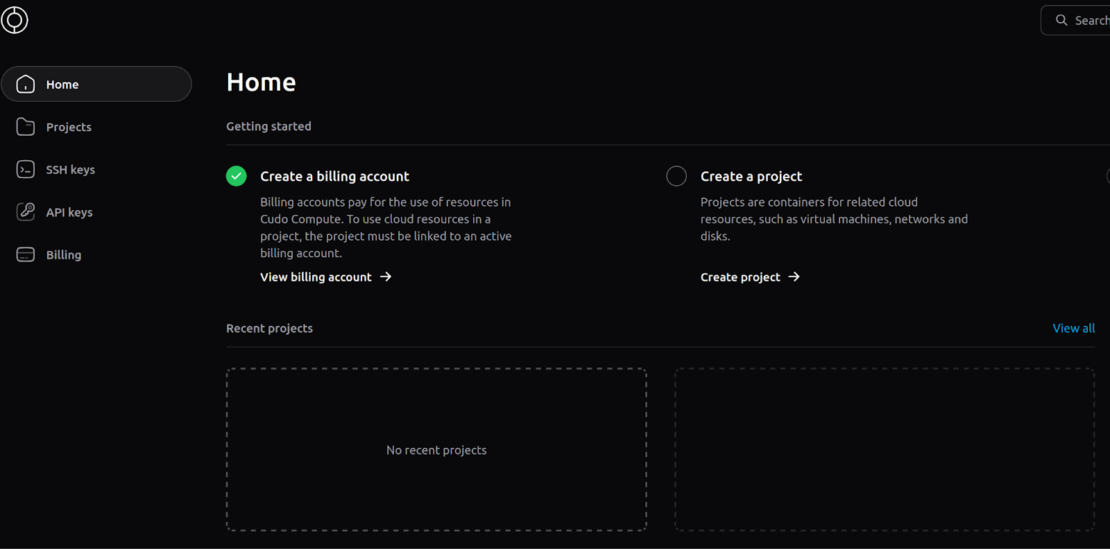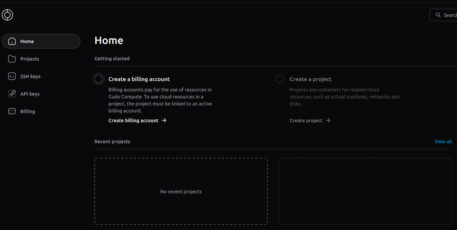 After your billing account has been created, you can then create a project, to access all the features of the compute offering. To do so, simply click on “Create a project”, choose a name for it and select your billing account.